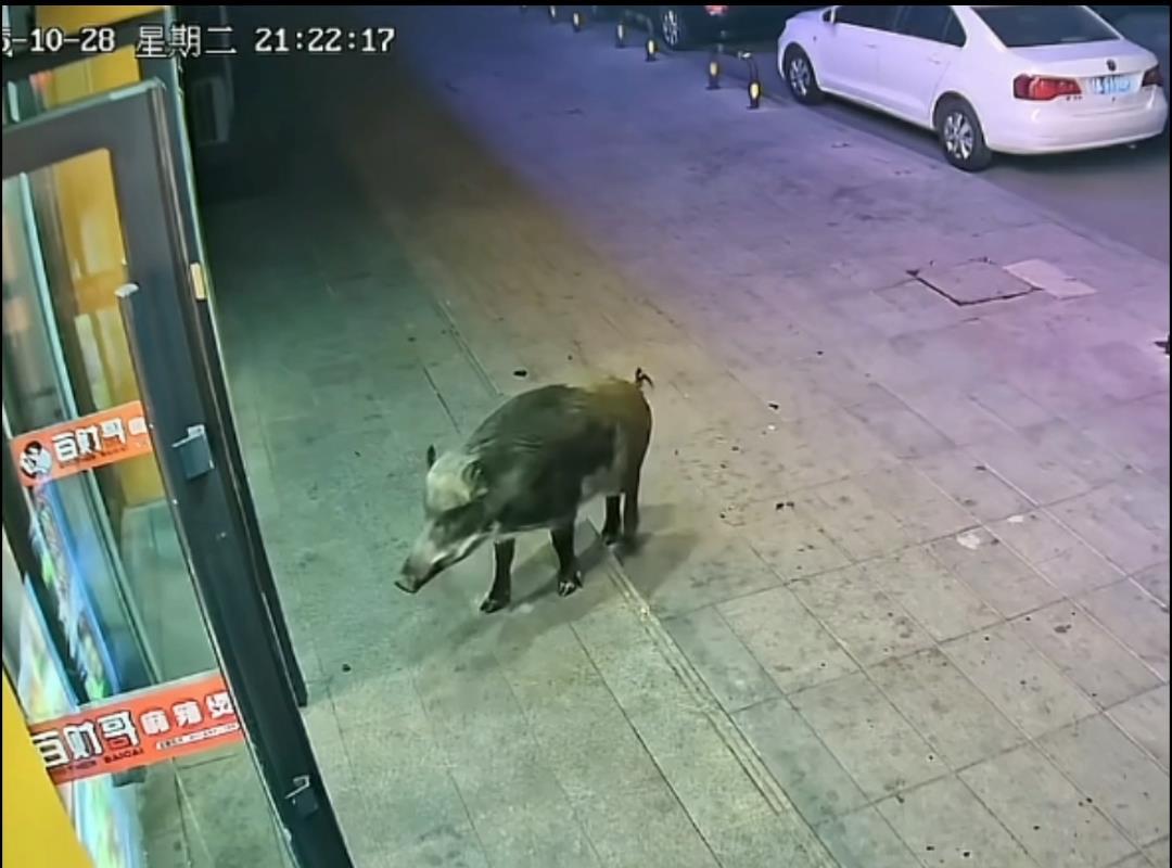 网友供给的门店监控视频显现,2025年10月28日21时22分,一头野猪在路周围左顾右盼后,一头撞上周围的玻璃门。视频中,玻璃门被碰击后产生颤动,随后野猪逃走并消失在黑夜中。